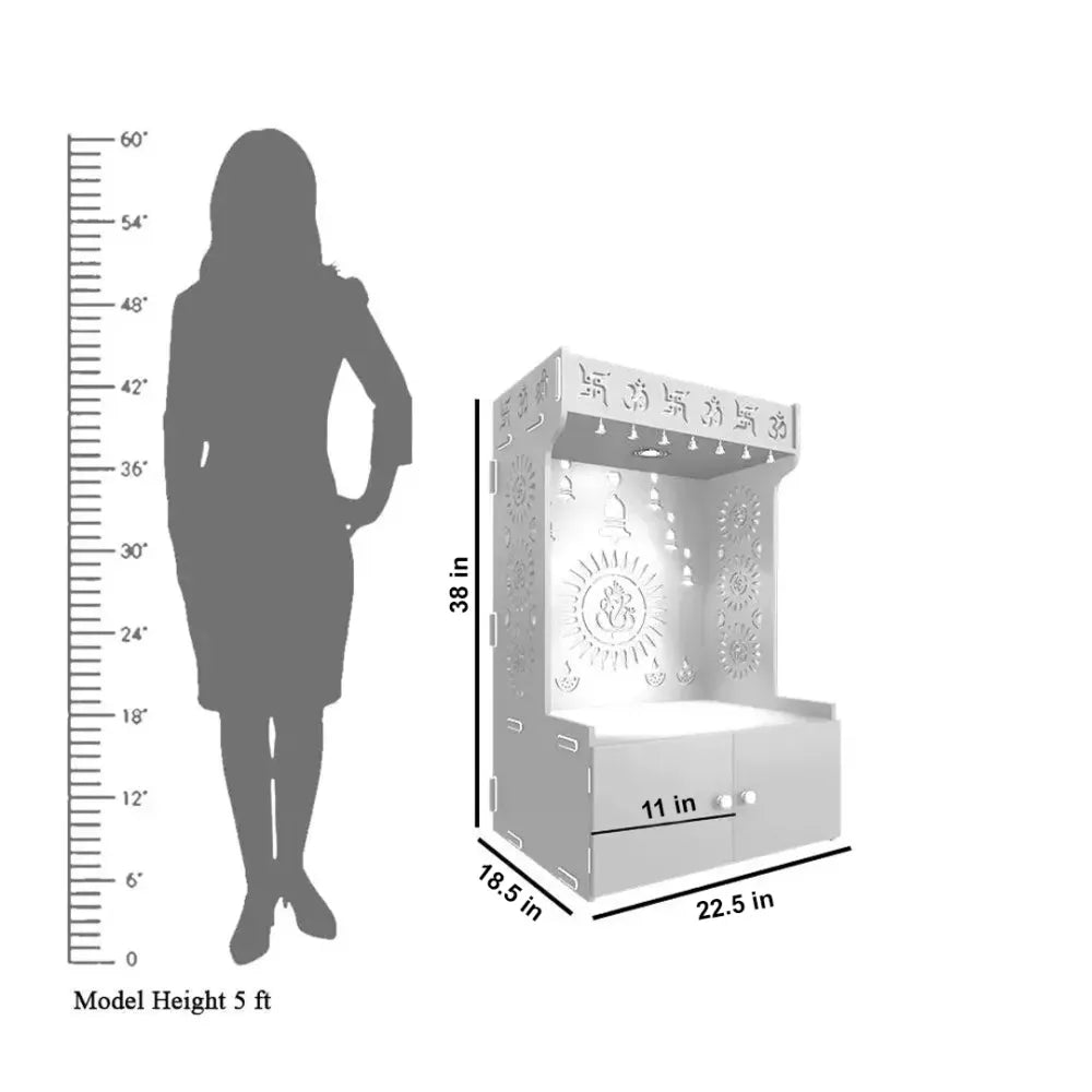 Divine Wooden White Home Temple With Spacious Shelf & Inbuilt Focus Light