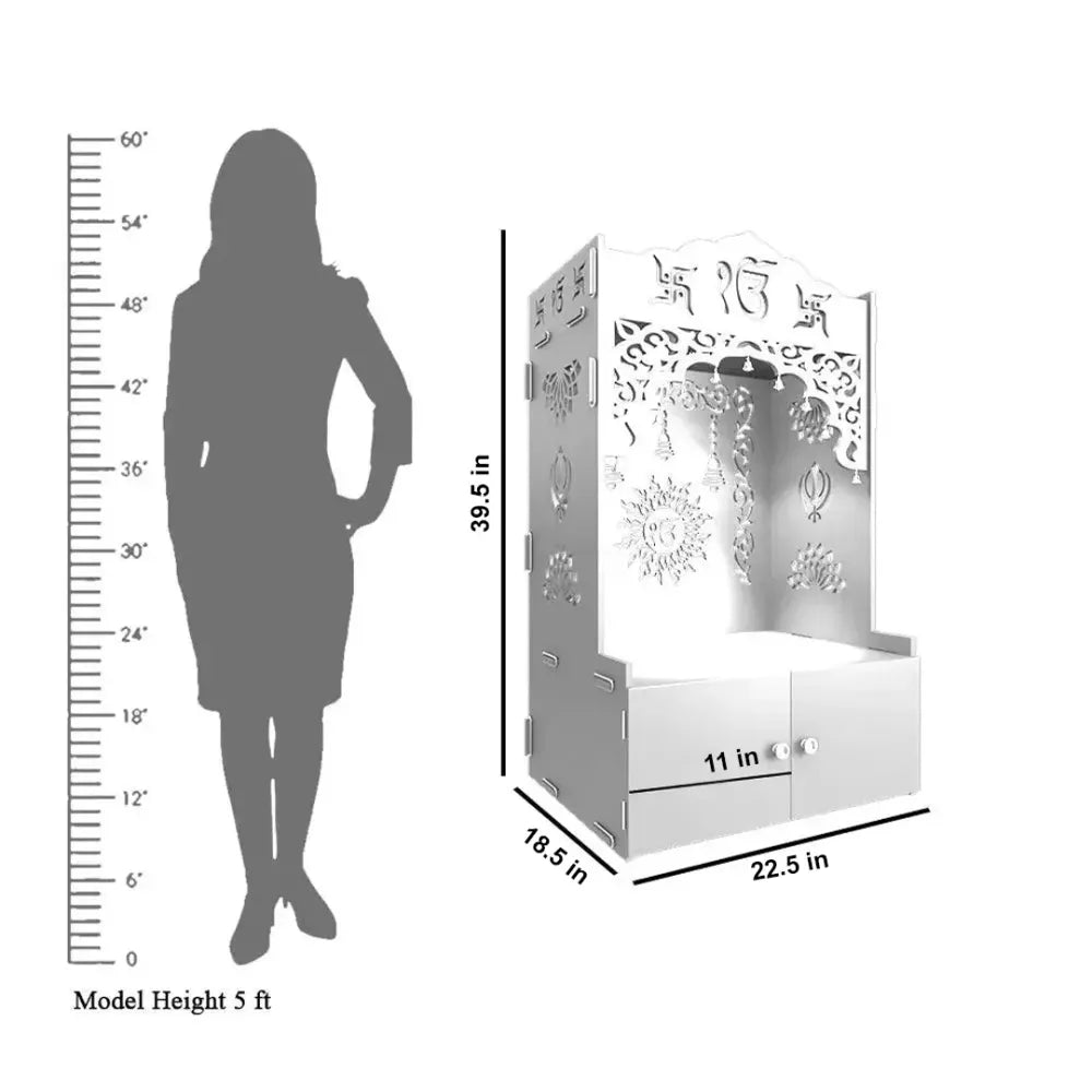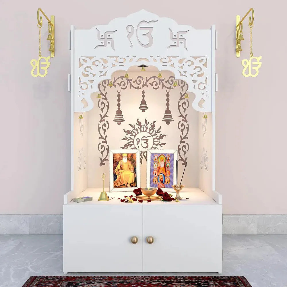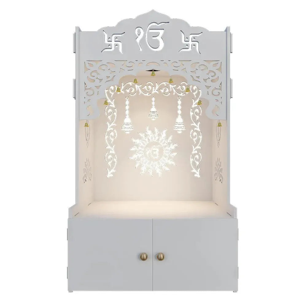 Ek-onkar Home Temple with Inbuilt Focus Light & Spacious Wooden Shelf- White