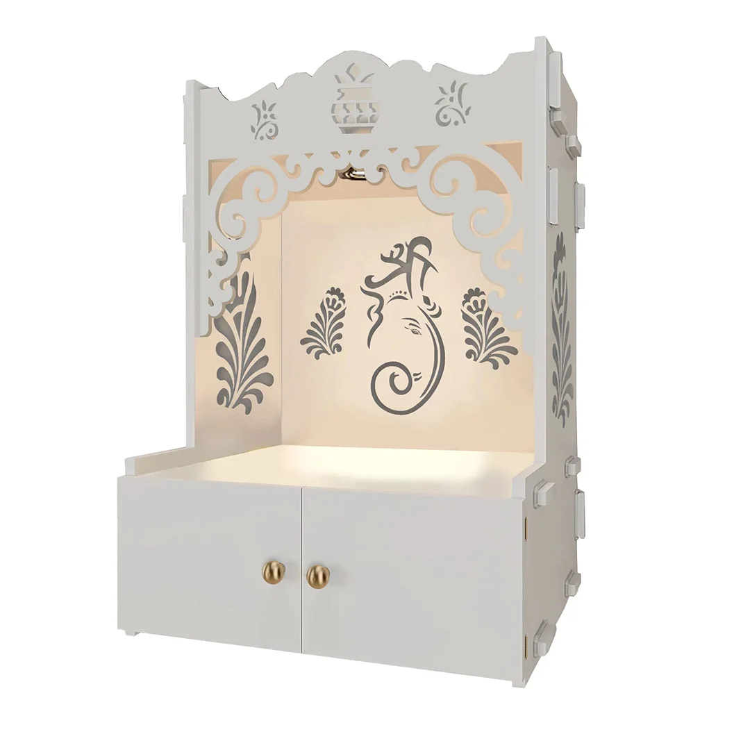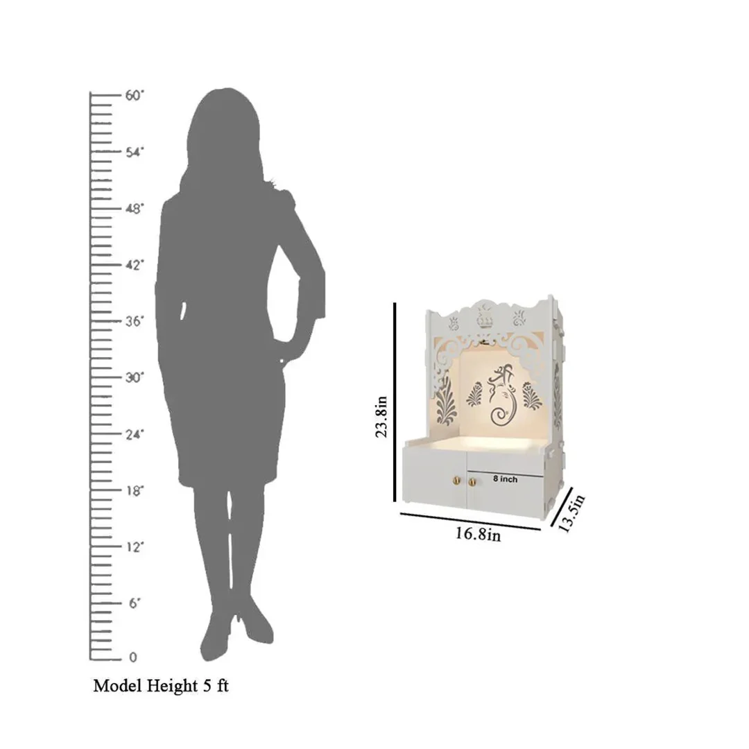 Elevate your spiritual rituals with this beautifully handcrafted wooden pooja mandir, designed to bring peace, devotion, and grace into your home. Crafted from high-quality, termite-proof MDF wood, it offers lasting durability along with timeless charm. Measuring 16.8 inches in length, 13.5 inches in width, and 23.8 inches in height, this compact yet spacious mandir is ideal for modern homes with limited space. A soft inbuilt focus light gently highlights your deities, creating a serene ambiance for prayer and meditation. The thoughtfully designed shelf provides ample room to organize your essential puja items. Elegant yet functional, this mandir blends effortlessly into any décor, becoming a sacred centerpiece that invites divine energy into every corner of your home.