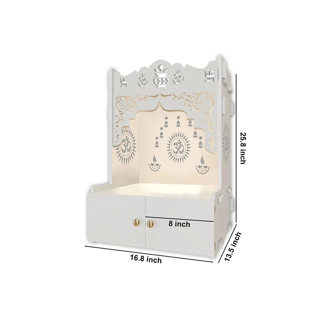 Experience spiritual elegance with this exquisite handcrafted wooden pooja mandir, designed to create a serene and sacred space in your home. Made from premium, termite-proof MDF wood, it offers long-lasting durability and refined beauty. The intricate design reflects fine craftsmanship, while the inbuilt soft-glow focus light gently illuminates the sanctum, enhancing the spiritual ambiance. With dimensions of 16.8 inches in length, 13.5 inches in width, and 25.8 inches in height, this compact yet spacious mandir fits perfectly in any room. A thoughtfully designed shelf provides easy access to all your puja essentials, making daily rituals effortless. A harmonious blend of tradition and functionality, this mandir serves as a beautiful centerpiece and a cherished space for your spiritual practices.