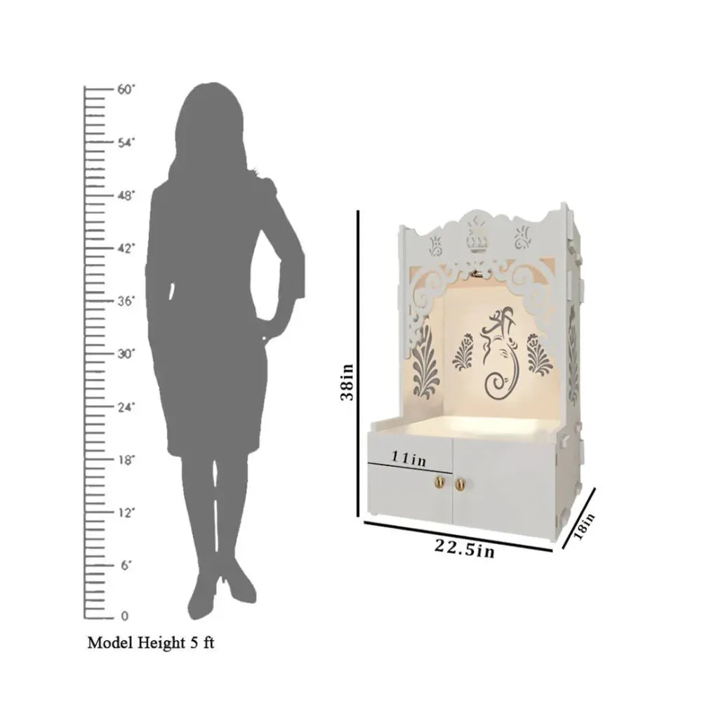 Elevate your spiritual rituals with this beautifully handcrafted wooden pooja mandir, designed to infuse peace, devotion, and grace into your home. Made from premium, termite-proof MDF wood, it ensures long-lasting durability while retaining timeless charm. Measuring 22.5 x 18 x 38 inches, this compact yet spacious mandir is ideal for modern homes with limited space. A soft inbuilt focus light illuminates your deities, creating a serene and divine atmosphere for prayer and meditation. The thoughtfully designed shelf offers ample space to organize your essential puja items neatly. Elegant and functional, this wooden mandir blends seamlessly with any décor, making it a sacred centerpiece that enhances your home while inviting divine energy and spiritual harmony into your everyday life.