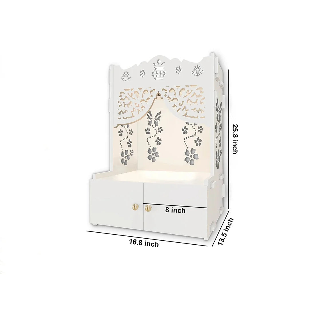 Bring the divine into your home with this handcrafted wooden pooja mandir that embodies spiritual serenity and timeless elegance. A true testament to skilled Indian craftsmanship, it features intricate patterns that evoke peace and devotion. Crafted from durable, termite-proof MDF wood, the mandir is built to last while offering a refined aesthetic. The spacious shelf measures 16.8" in length, 13.5" in width, and the overall height stands at 25.8", making it ideal for housing your puja essentials. An inbuilt focus light softly illuminates the sacred space, creating a warm and inviting atmosphere for your daily rituals. This exquisite mandir is perfect for cultivating a tranquil corner in your home, nurturing inner peace, clarity, and a deeper spiritual connection.