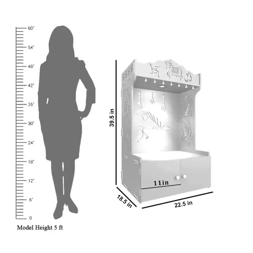 Welcome the majestic White Mor Pankh Temple into your home – a handcrafted wooden pooja mandir that radiates spiritual serenity. Standing at 22.5 inches in length, 18.5 inches in width, and 39.5 inches in height, it features a sturdy structure with a spacious shelf for your cherished puja essentials. Delicate metallic bells add a soothing, soulful touch, while the inbuilt focus light illuminates intricate carvings in a warm, divine glow. Crafted from high-quality 12 mm thick MDF wood with a white melamine finish, it offers durability and easy maintenance. Each piece is uniquely handcrafted, ensuring slight variations in color and design. With its firm base and elegant presence, this temple creates a sacred space that nurtures peace and devotion.
