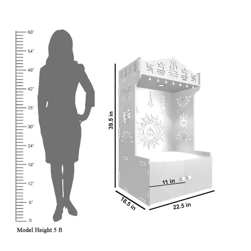 Immerse yourself in the divine with our breathtaking Handcrafted Wooden Pooja Mandir, crafted by skilled artisans with intricate designs and delicate metallic bells that bring elegance to your worship space. The inbuilt focus light softly illuminates your puja essentials, creating a serene ambiance that radiates positivity and tranquility. Made from termite-proof MDF wood, this temple is both beautiful and durable, ensuring lasting devotion. With a spacious shelf, it perfectly accommodates your sacred idols and essentials, blending tradition with modernity. Measuring 39.5*22.5*18.5 inches, it offers a graceful haven for your spiritual journey. Handcrafted with love and devotion, this masterpiece invites the divine light into your home, inspiring peace, spiritual growth, and a deep connection to India's rich cultural heritage